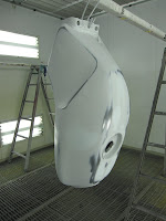パテ成形前にペーパーを当ててパテとの密着性を高めるとともに微妙な成形も行います。